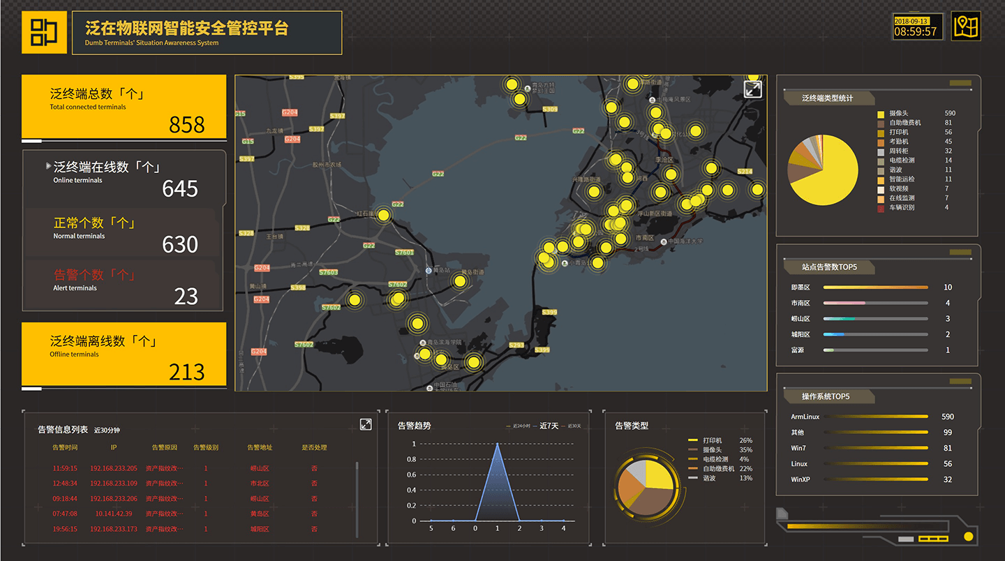 泛在物联网安全智能管控平台是一个包含泛终端资产与安全防护网关综合管理、安全审计、策略中心、态势感知的综合应用服务平台。 平台包含泛终端边界安全防护网关和安全管控平台两部分。 今年以来,我们与国网山东公司合作了泛在物联网安全智能管控平台项目,该项目部署了400余台泛终端边界安全防护网关, 山东全省17个地市均已实施,覆盖了国网山东公司10万余台物联网终端设备,该设备包含摄像头、巡检机器人、打印机、周专柜、DTU等10大类别。 日产生安全日志百万级别,发现大量违规与非必要业务。该平台上线以来,为客户提供了实时安全事件告警、实时资产分布、终端安全防护等重要信息和服务, 极大地降低了客户信息系统的安全和运维成本,充分保障了业务方的终端数据安全。